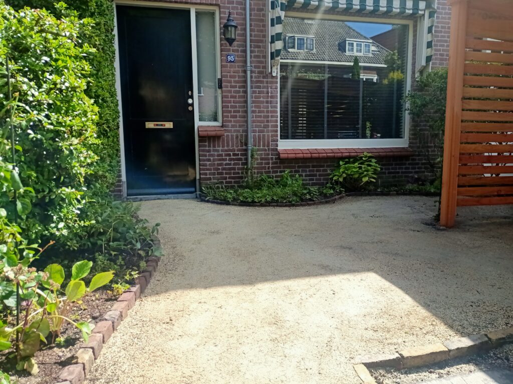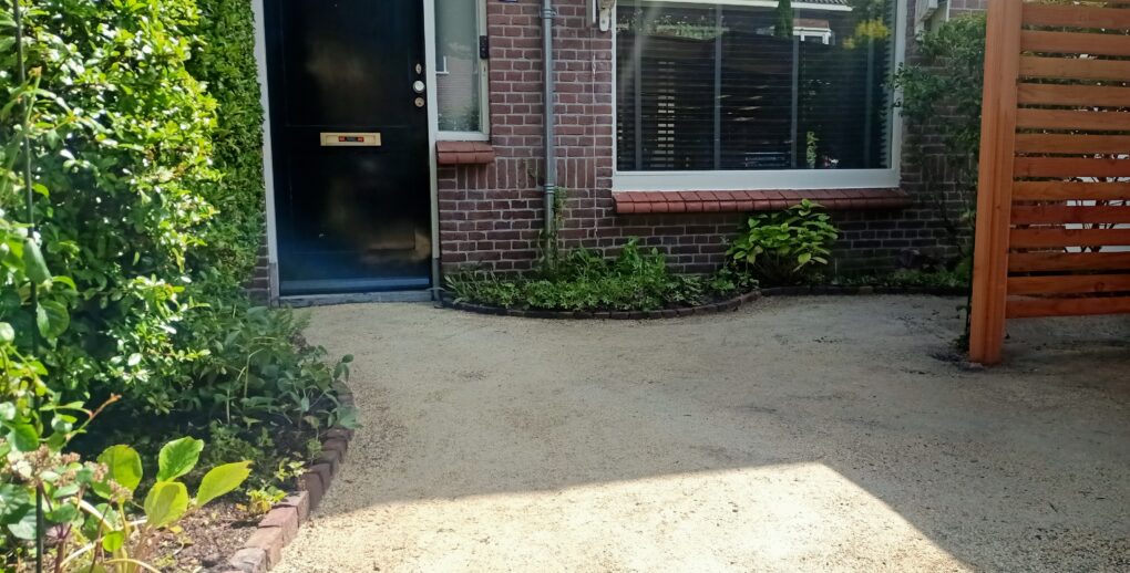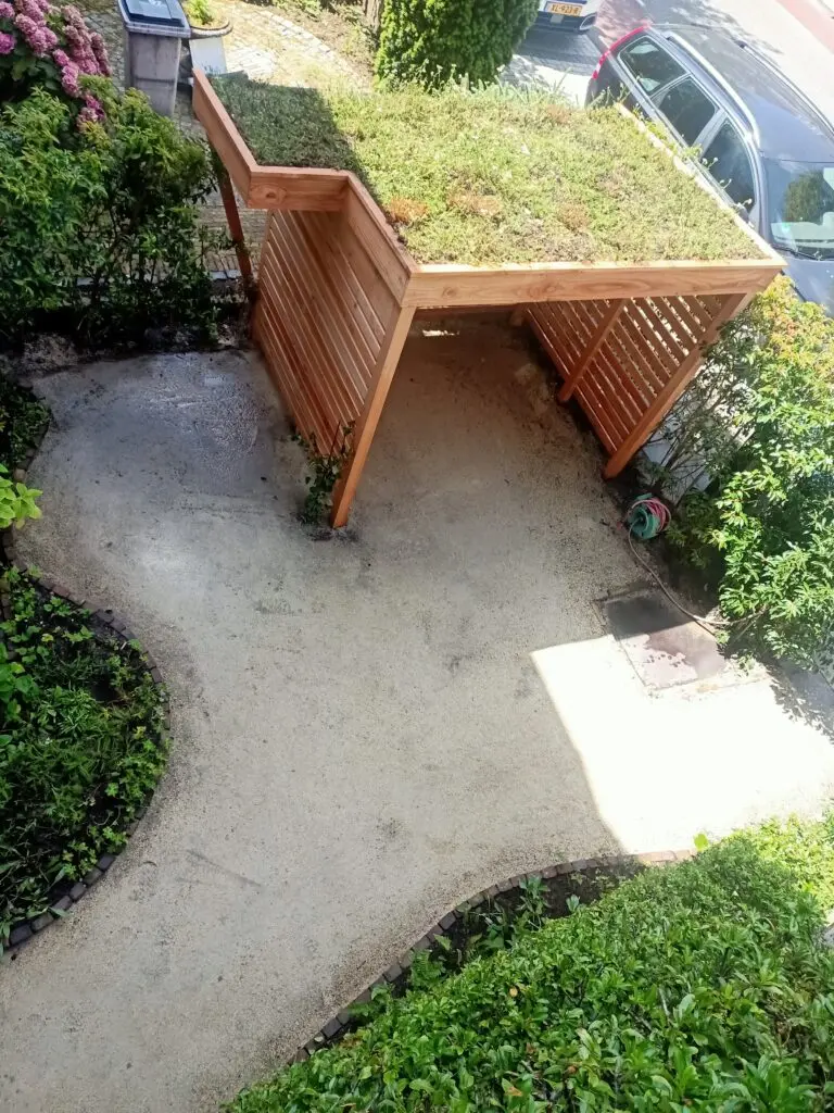 Transformatie van een bestaande voortuin naar een moderne groene en functionele voortuin met fietsoverkapping met kruidendak. Gemaakt met lokaal inlands kwalitatief douglas hout en bijpassende beplanting. Verharding bestaande uit Nobrecal, een halfverharding, gewonnen in Zuid-Limburg. Opsluiting middels hergebruik oude waaltjes.