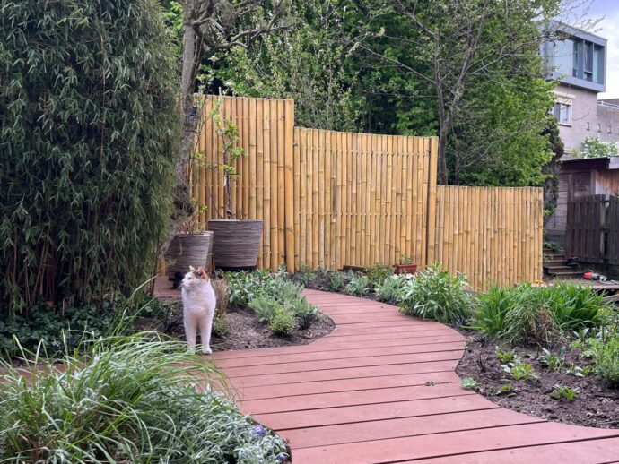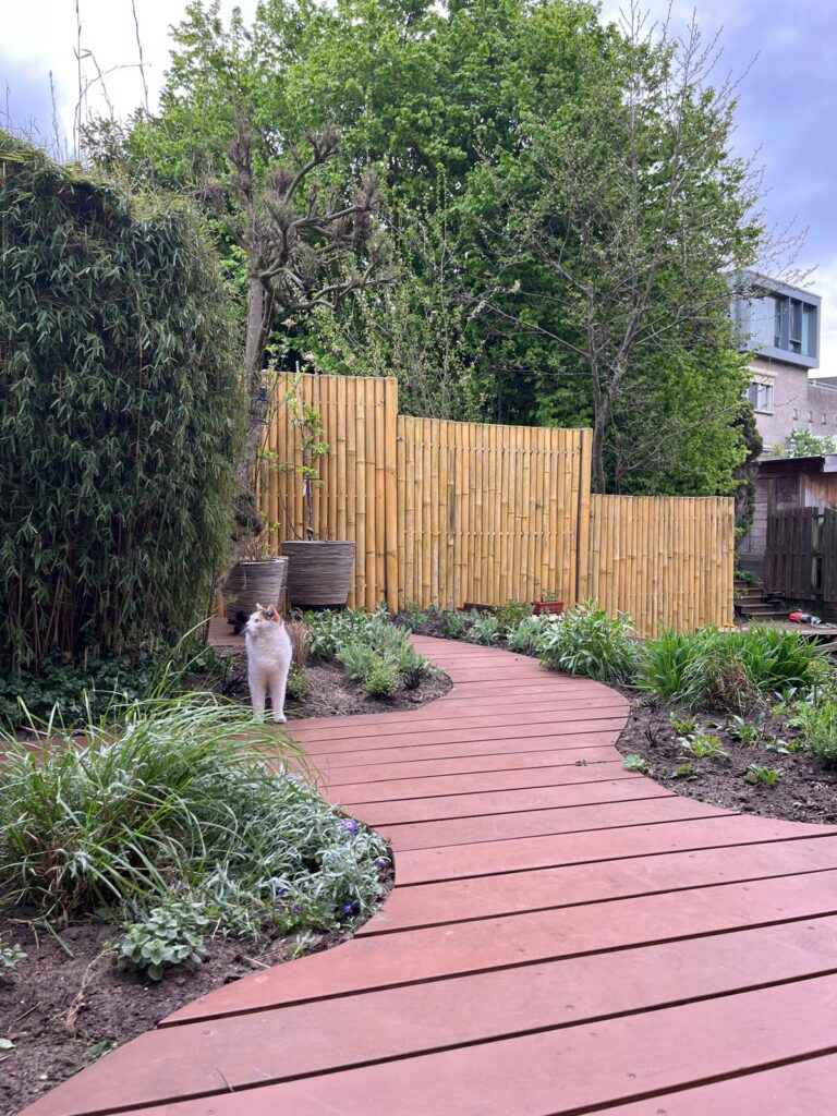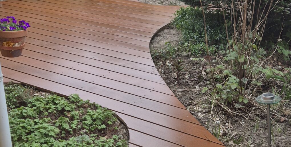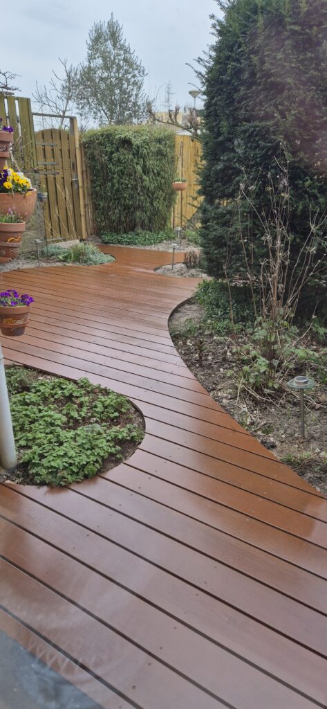 De oorspronkelijke vlonder had het einde van haar levensduur bereikt en was toe aan vervanging. We hebben een compleet nieuwe vlonder aangelegd, vervaardigd uit duurzaam en gekeurd Ipé hardhout – een houtsoort die bekendstaat om haar lange levensduur en natuurlijke uitstraling. In de laatste fase hebben wij de vlonder met terrasolie van Osmo behandeld. De vlonder is uitgevoerd in een organische vorm, die mooi aansluit bij de lijnen en sfeer van de bestaande tuin. Zo vormt het geheel weer een harmonieus en uitnodigend buitenverblijf, perfect om van te genieten in alle seizoenen.